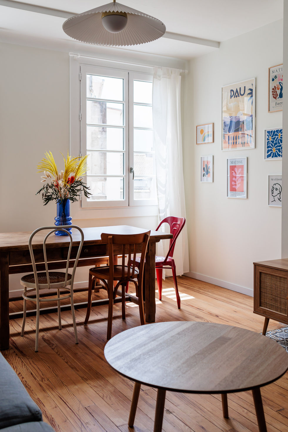 La rénovation de cet appartement, destiné à la colocation, allie modernité et convivialité. Le choix de conserver certains matériaux existants et de chiner le mobilier apporte une touche vintage et authentique. Les couleurs dynamisent les espaces - une teinte par chambre et un bleu klein dans le salon - pour un intérieur prêt à vivre.