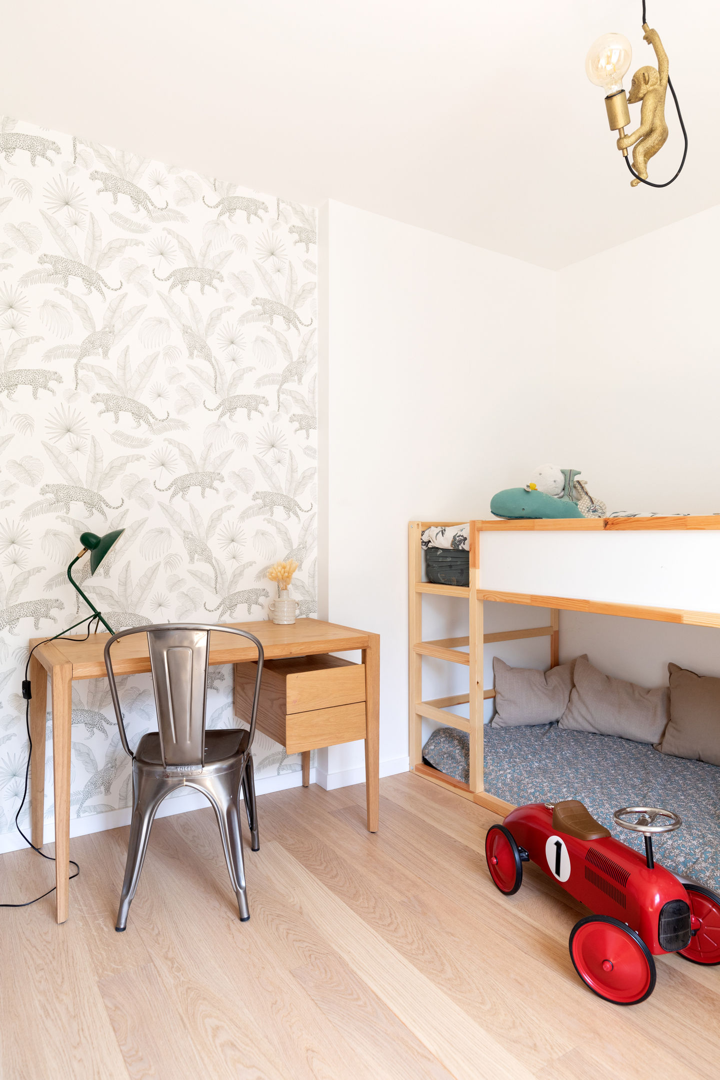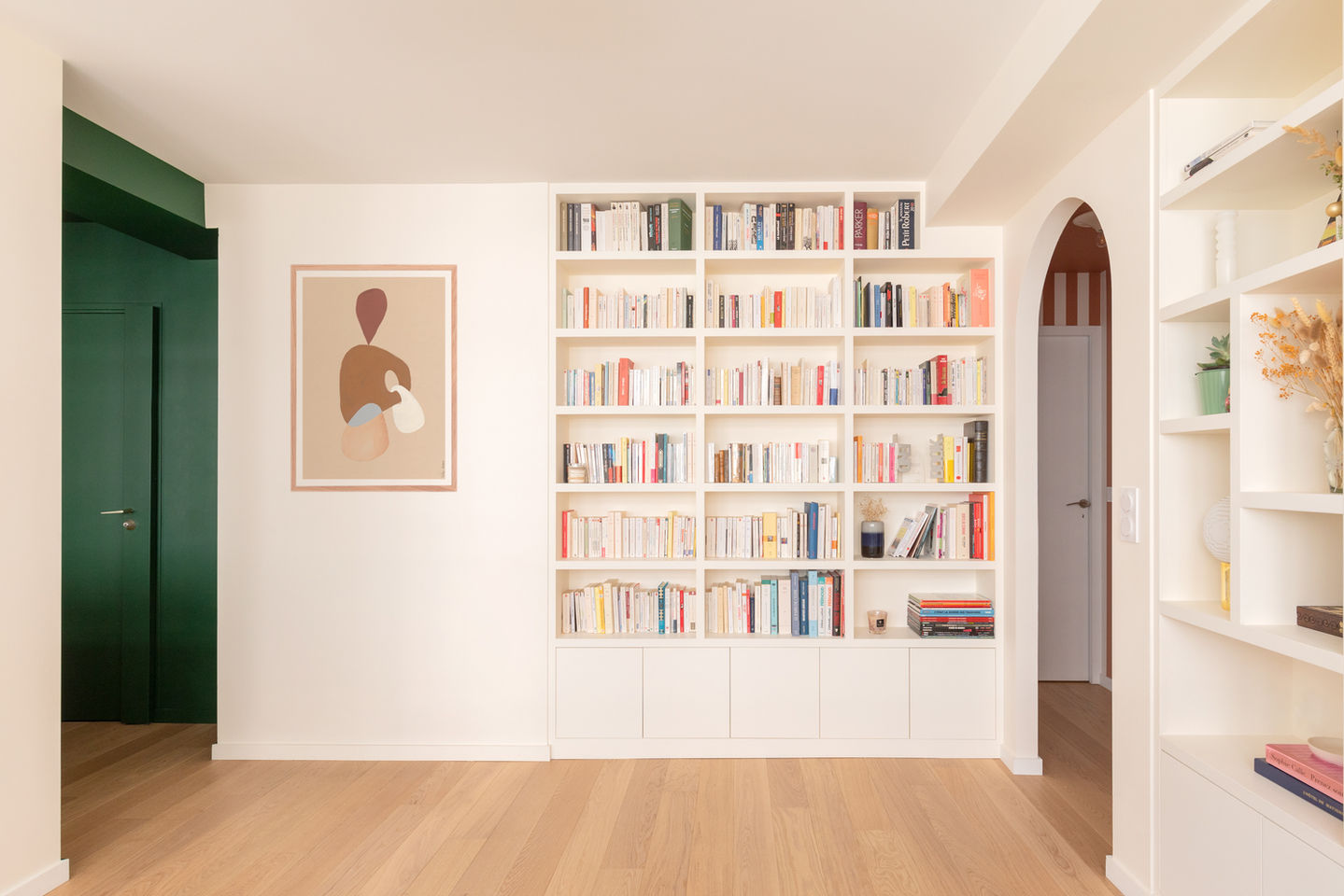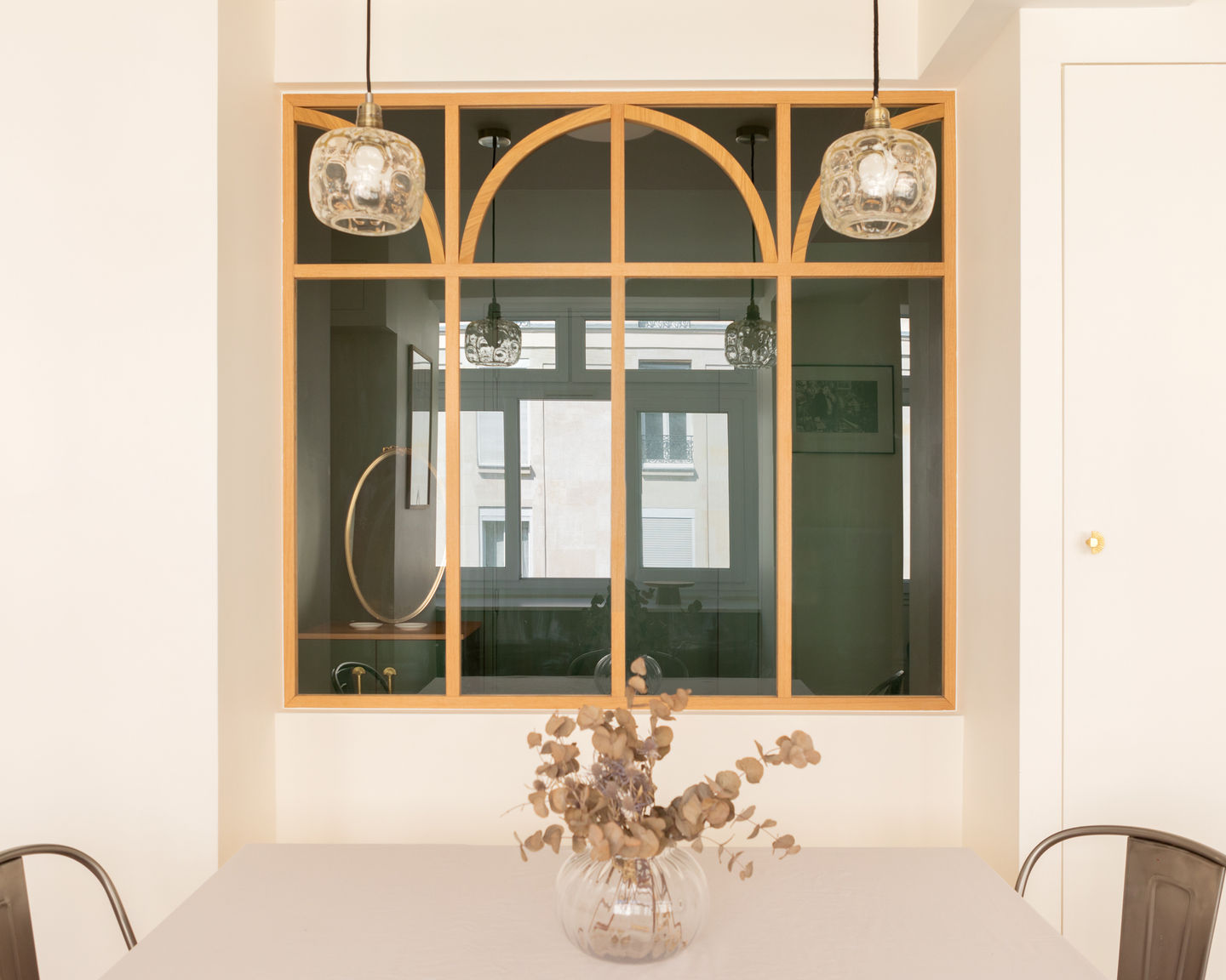 Dans cet appartement, les espaces étaient mal distribués. Notre intervention a permis de repenser l’aménagement et de créer deux parties : jour et nuit avec leurs identités distinctes. Les couleurs fortes ont permis de marquer les espaces. L’entrée verte et sa verrière aux lignes arrondies permet d’avoir une vue sur la grande pièce de vie lumineuse. Le dégagement et son papier peint rayé couleur terracotta dessert les chambres et les salles de bains.